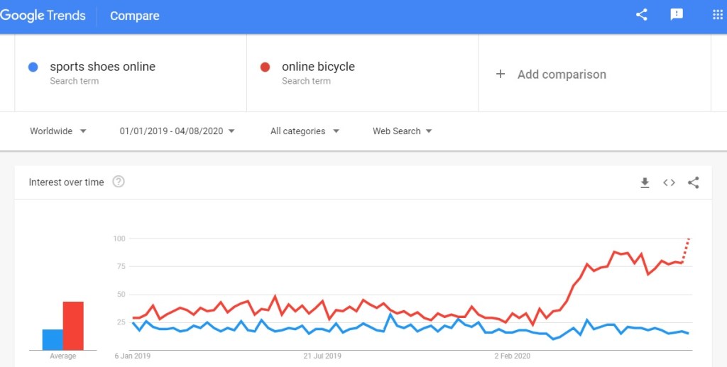 Google trends shows a massive surge in web search around buying cycles online starting March and the upward trend still continues. I compared it with the web search trend for sports shoes online (another fast selling sports gear) to demonstrate how drastic the surge in interest towards cycles has been over past 4-5 months. The trend chart for India is no different.