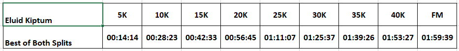 Imagine a runner named Eluid Kiptum. This runner runs the best of the 5K splits across these two races. What would be his finish time? This time to me would represent the pinnacle of human endurance.