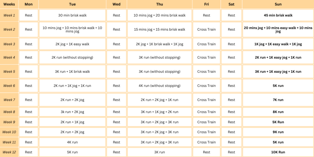 PS: This training plan is drawn out of my personal experience. I do not (yet) hold a formal running coach certification and please use this more as a guide rather than a coach-prescribed routine. As mentioned in the article, I have seen a large number of folks who successfully began their running journeys with a basic program like this.